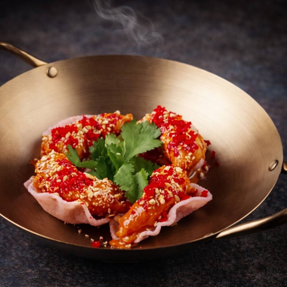 Очень вкусное блюдо из тигровых креветок, обжаренных в кляре, подается блюдо на креветочных чипсах, украшается икрой летучей рыбы и арахисом, поливается соусом том ям