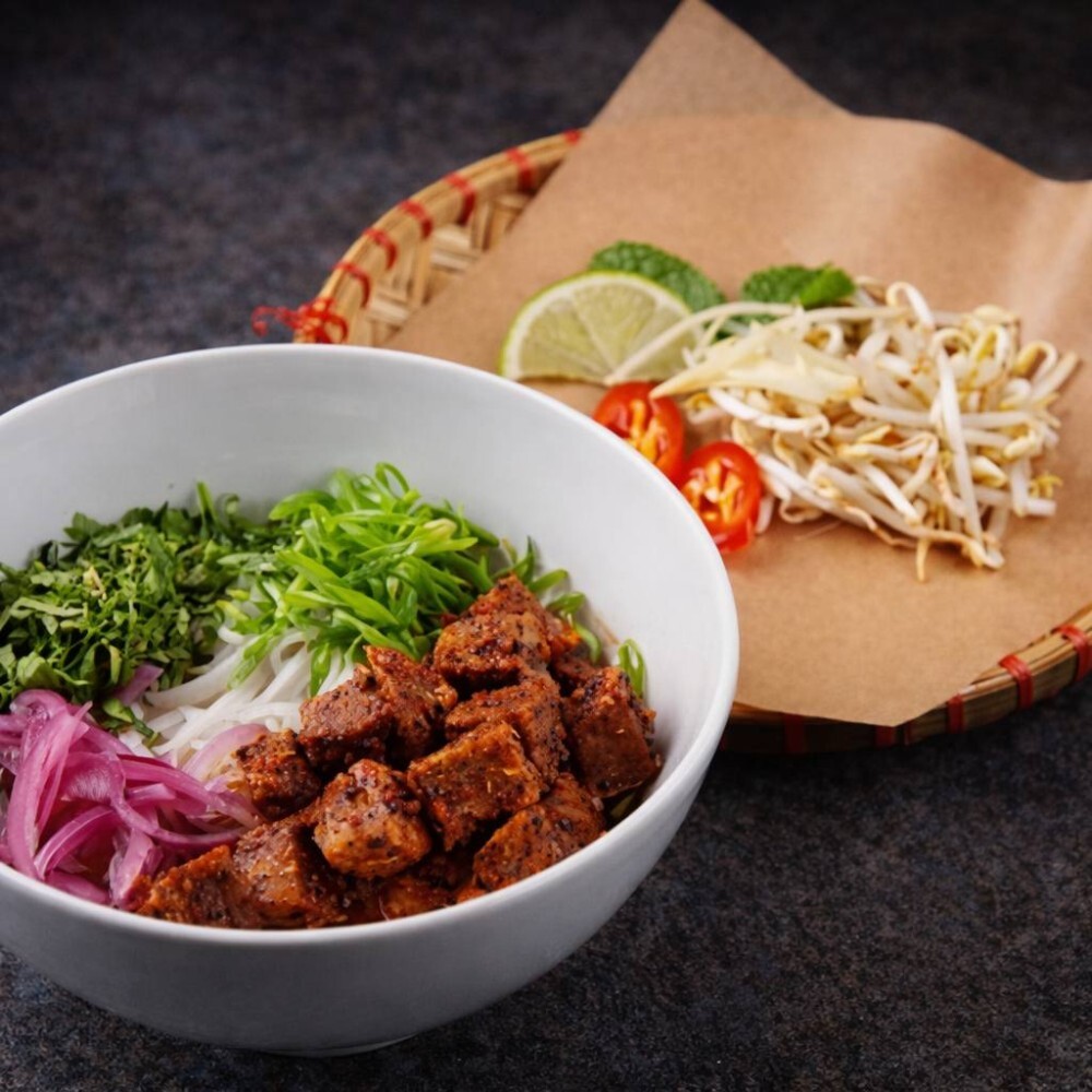 Наваристый говяжий бульон с рисовой лапшой, тушенной в черном перце говядиной, зеленью и свежими ростками сои подается с тремя видами соуса