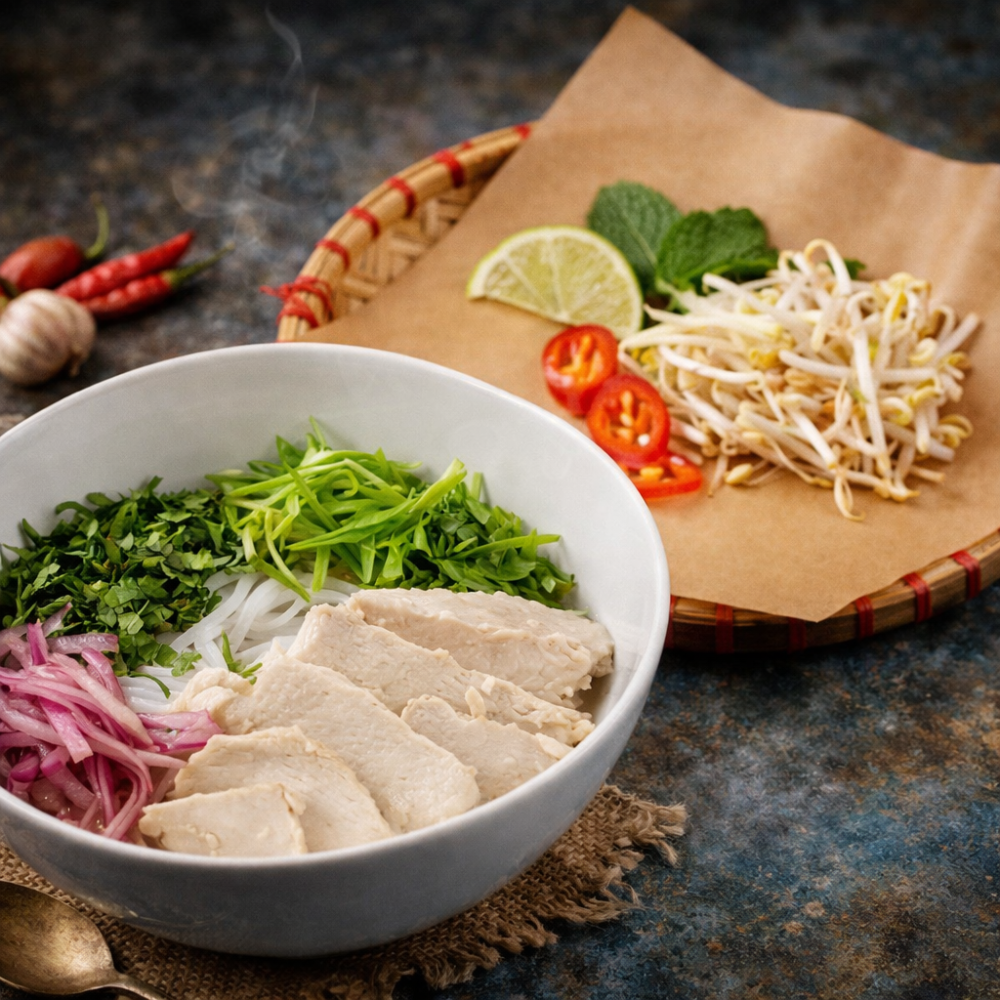 Наваристый говяжий бульон с рисовой лапшой, отварной куриной грудкой, зеленью и свежими ростками сои подается с тремя видами соуса