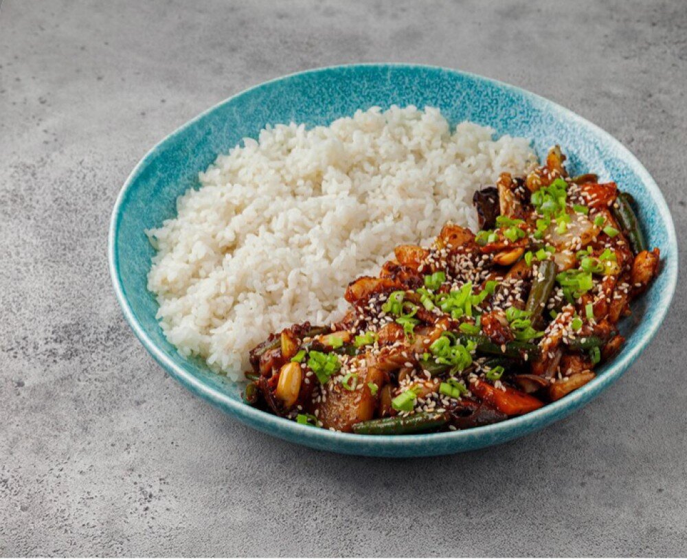 Мясо, обжаренное с овощами в соусе на выбор, украшается кунжутом и зеленым луком, подается с паровым рисом