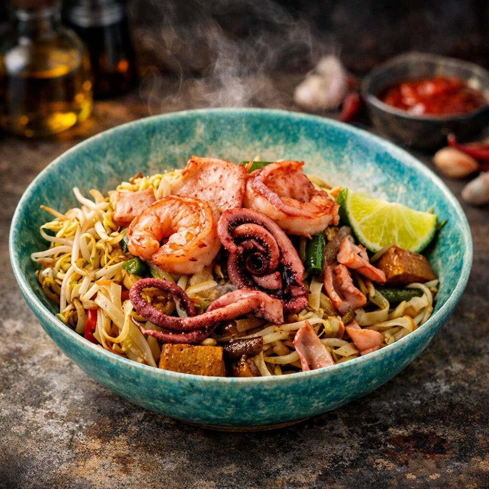 Традиционная вьетнамская лапша с морепродуктами, ростками сои и арахисом в соусе Пад Тай